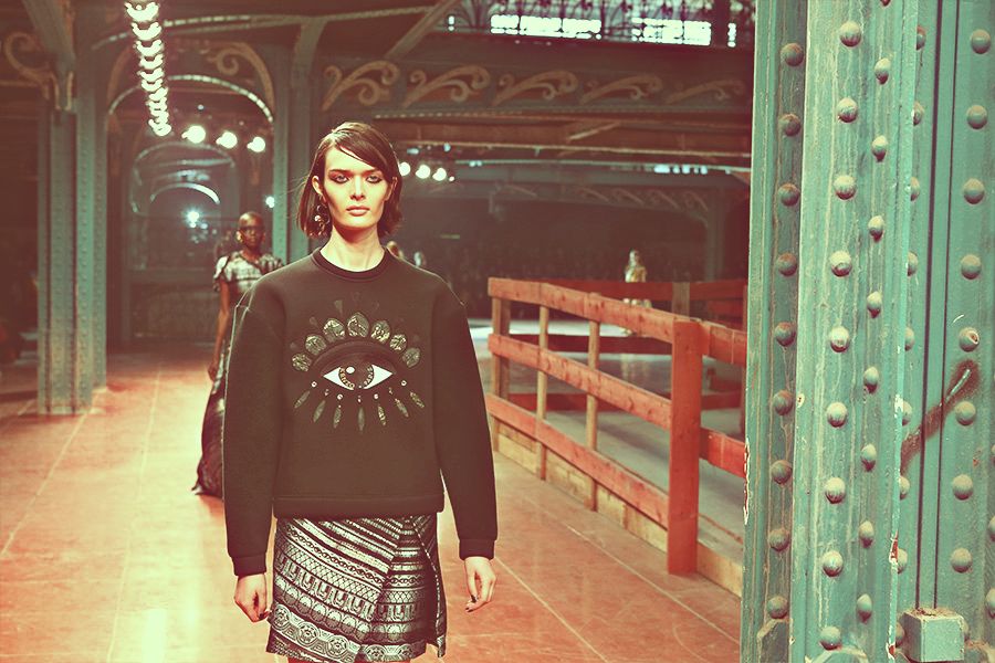 For KENZO’s Fall Winter 13 collection, it was evident that ancient Asian temples around India, Nepal and China influenced the look of the AW13 clothing. We were taken on a mythological pilgrimage to the soaring heights of the temple’s pinnacles where the symbol of the Eye beams as a protector in all directions of North, South, East and West., rings, bracelets and earrings embracing the eye motif throughout. This eye motif is normally a sign of protection and luck, found on jewellery.
