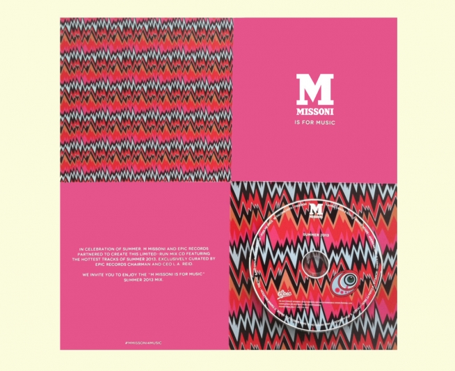 M Missoni have created a fashion soundtrack CD with Epic Records for SS13 ! Artists featuring on the album are Paloma Faith, Avril Lavigne, Nyla, Kat Dahlia, Bonnie McKee, Sara Bareilles and Tamar Braxton . The CD will be launched at a fashion pardy in NYC tomorrow. The music was curated by Epic Records chairman, L.A Reid. The compilation will be given to guests at their new store opening in Las Vegas along with a chairity event in the summer.