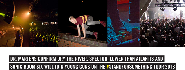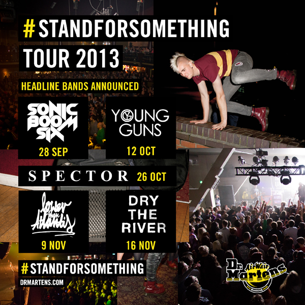 Dr. Martens are thrilled to confirm four of the UK’s most exciting live acts, Dry the River, Spector, Lower Than Atlantis and Sonic Boom Six will join Young Guns on their #STANDFORSOMETHING tour this Autumn. Dr. Martens will be hosting five gigs in five cities around the UK and the premise is simple: the country’s most rousing live acts in tiny venues, giving music lovers the chance to catch their favourite acts up close and personal. The five cities are Manchester, Bristol, London, Nottingham and Glasgow and this tour will also give a platform to a host of emerging support bands and talent from Dr. Martens’ partnership with music charity, Strummerville.