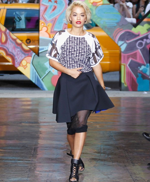 Rita Ora made an appearance at New York Fashion Week and we’re not talking about the front row. This year, DKNY brought back their 90’s fashion and successfully targeted the more urban following in the retail industry. Their recent artworks party event saw Rita Ora and Cara Delevingne perform at their London art evening. The fashion world has gone mad for logos this season, this is a perfect time for DKNY to re-brand their look. Today at New York fashion week, DKNY asked model Rita Ora to strut down their catwalk. Ora is also the new face of the DKNY AW13 campaign. Why choose a soundtrack when you can get the musician on the catwalk instead?! Oliver Spencer recently had Wretch 32 strut down his London fashion week runway, musicians on runways are the next marketing tool. Check out Getty images below…..