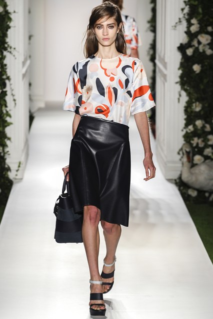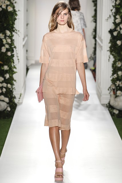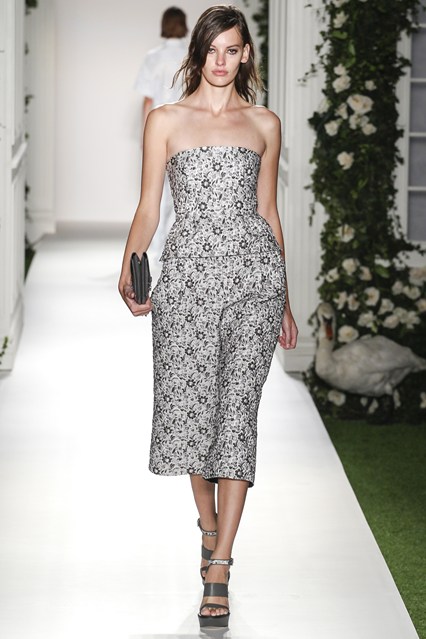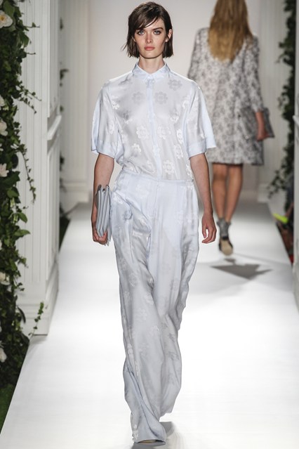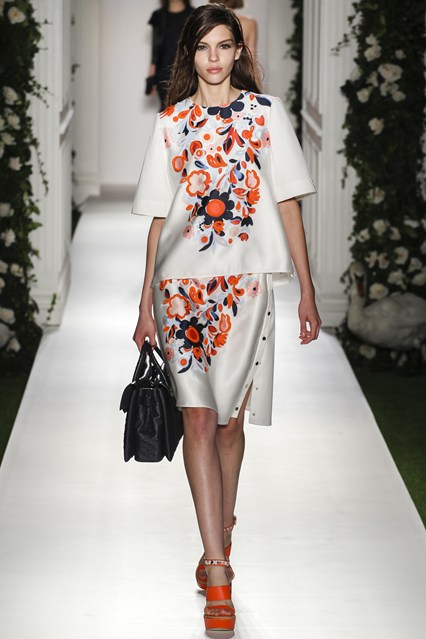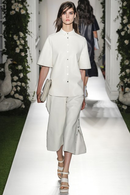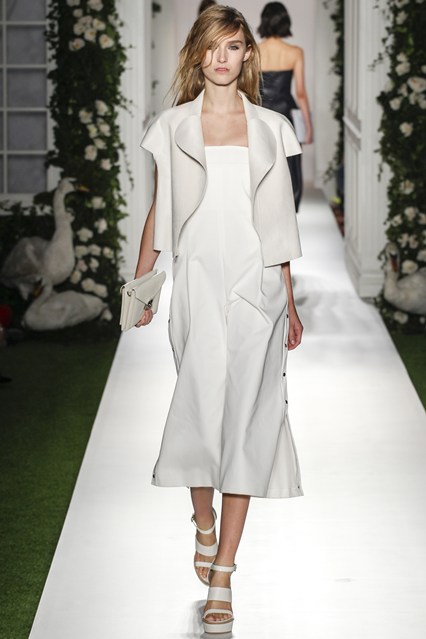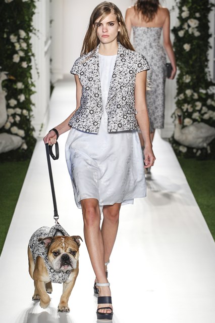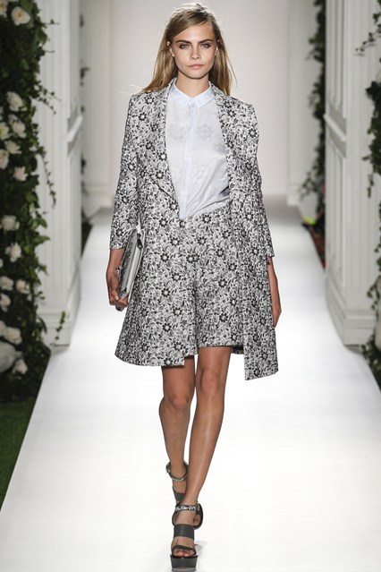 Mulberry was a beautiful scene today at Claridge’s in London. The set was very twee with an astro turf garden complete with ivy and roses. White doves and puppies were on this catwalk which was filled with grand pillars and wedding like props. The soundtrack was epic, a voice over of Winston Churchill echoed through the room “This house we have built together, brick by brick, stone by stone, this house we call home.” Cara Delevingne paraded down the runway to ‘Our House’ by Madness. Enjoy the official Vogue gallery….