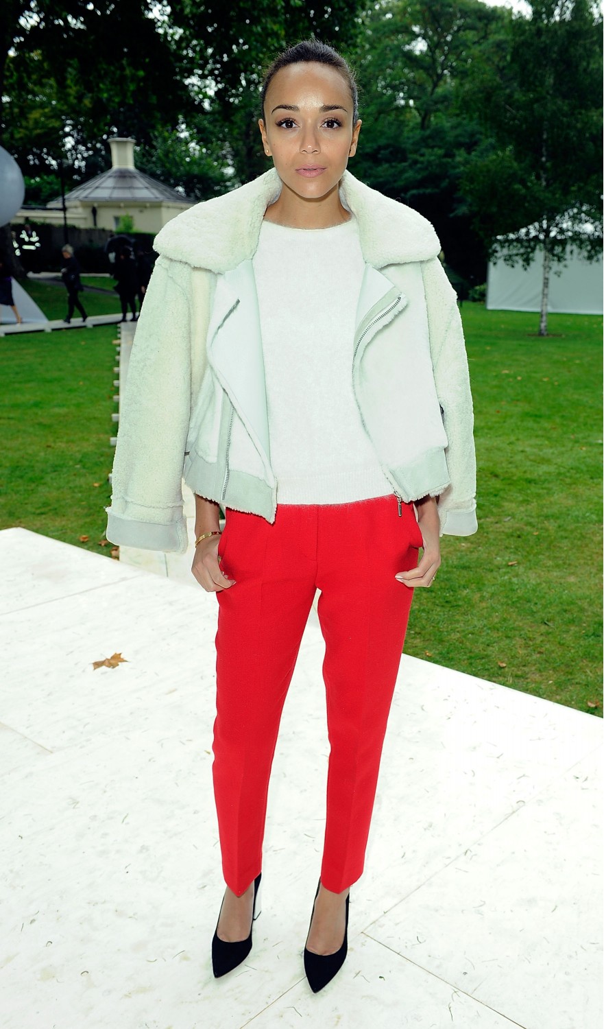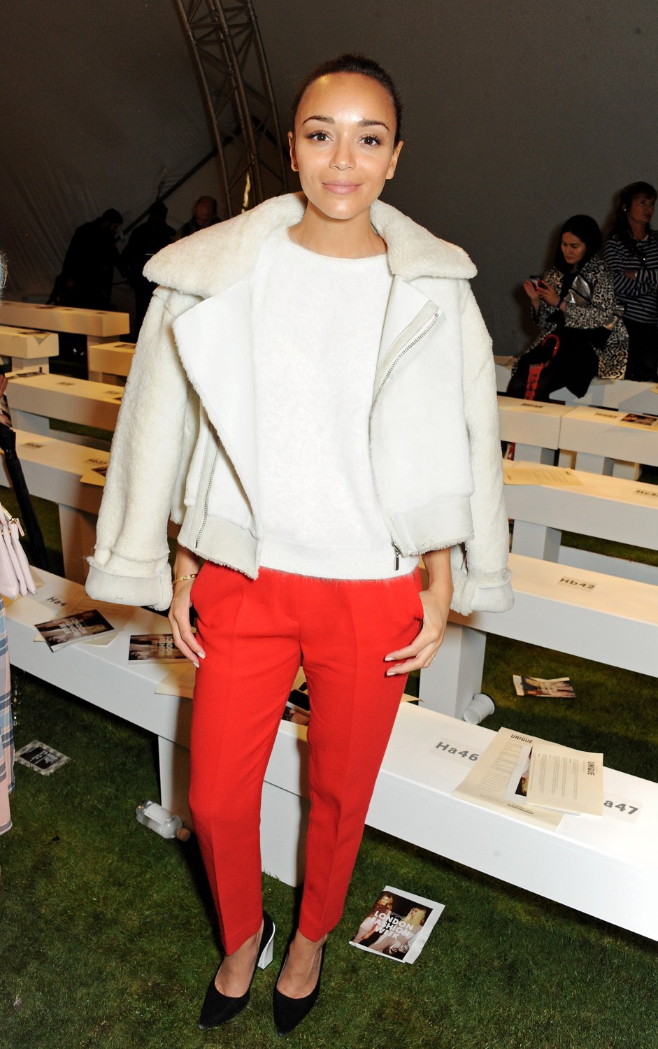 ASHLEY MADEKWE WEARS TOPSHOP UNIQUE JACKET £475, TOPSHOP BOUTIQUE JUMPER £68, TOPSHOP UNIQUE TROUSERS, £170 AND TOPSHOP SHOES, £62