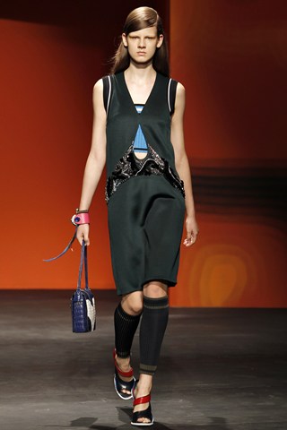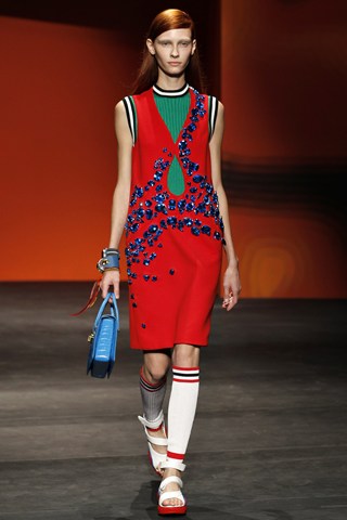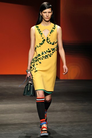 The Prada show was complete with illustration prints and an awesome soundtrack from M.I.A and Britney Spears. There was heavy embellishment with jewelled dresses. The colour scheme provided hinted at a new wardrobe palette from Khaki to mustard. Watch the show and listen to the Prada soundtrack below….
