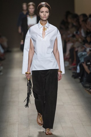 Valentino is known for it’s glamorous and demure fashions, this season was more urban and youthful. This was evident in the music change, beginning with arias from Bellini’s opera Norma and Puccini’s Tosca, ending with a modern day beat. Valentino will always have a loyal opera following so it does them no harm to appeal to the younger market through the use of hip hop tracks.