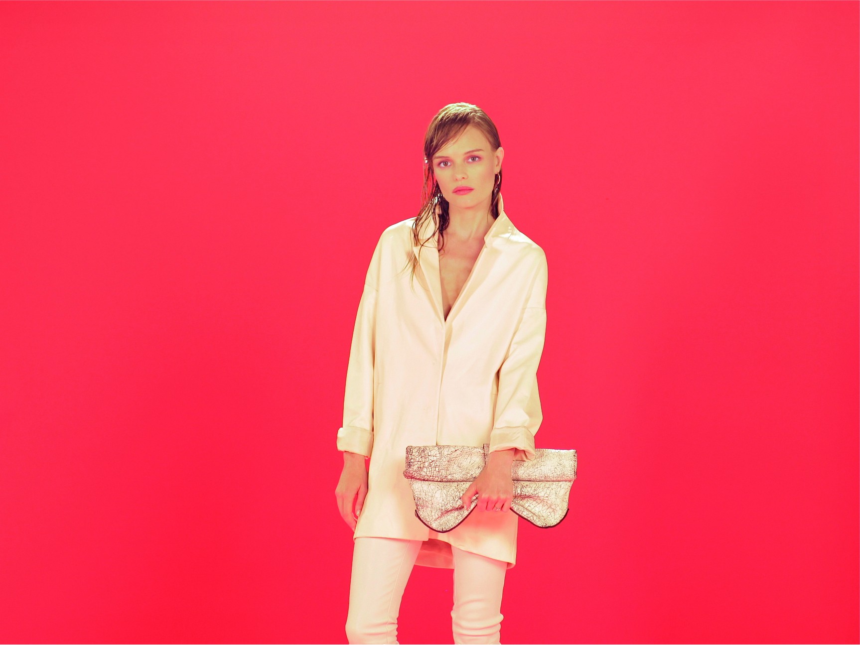 Bags are oversized and relaxed, a roll-top clutch in shearling and a zip-wallet in silver.