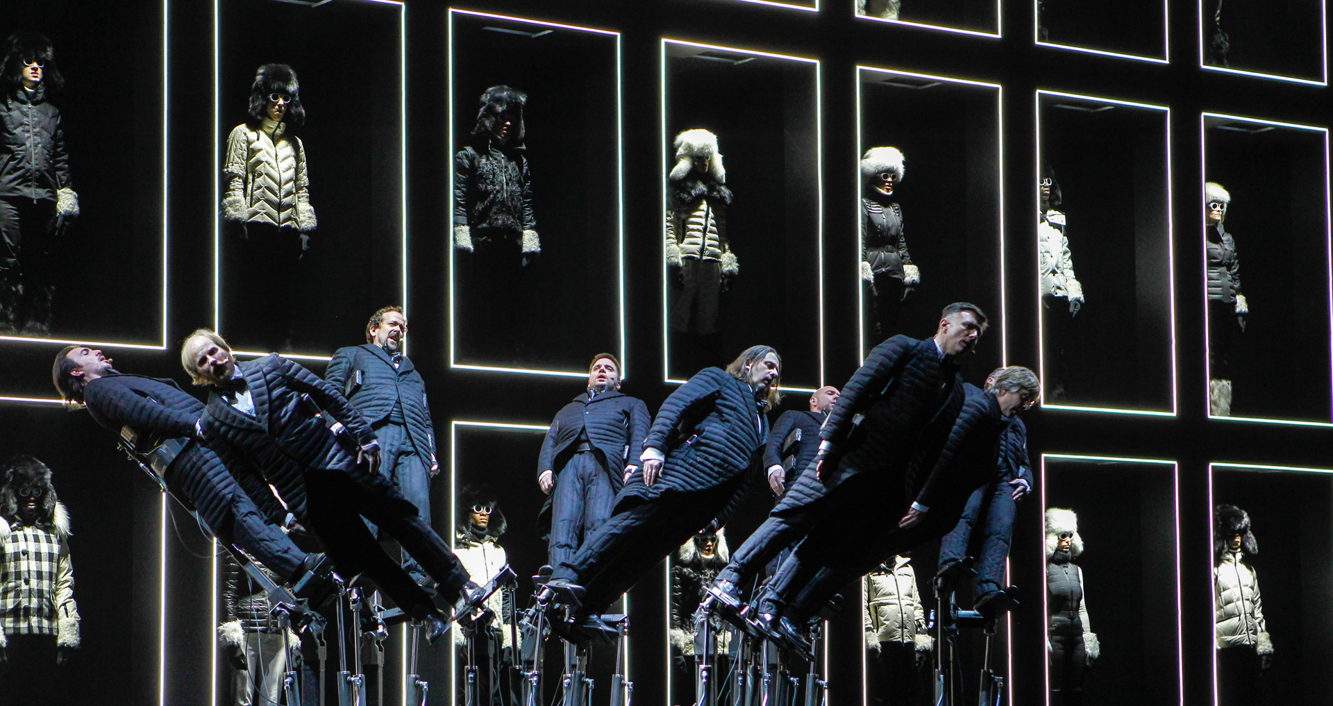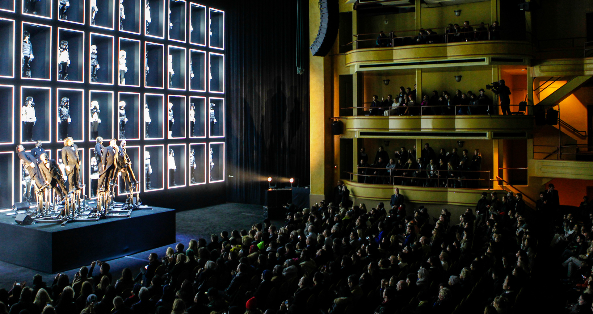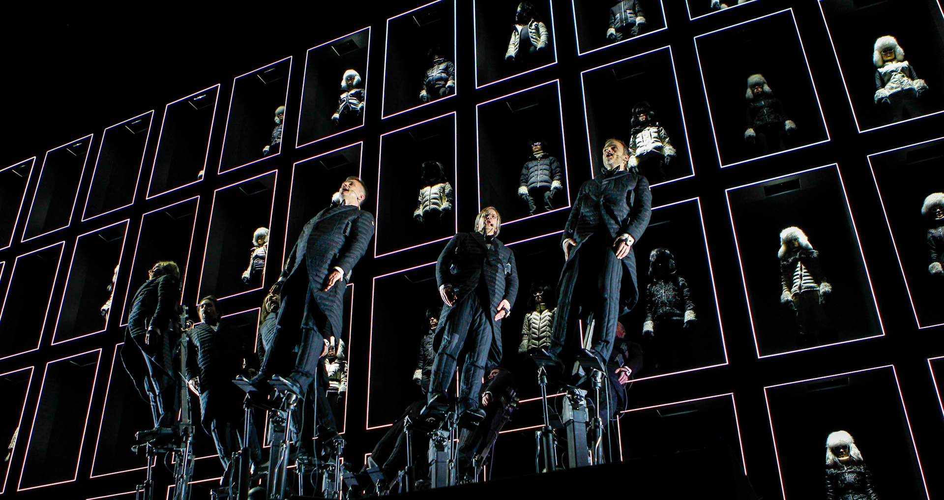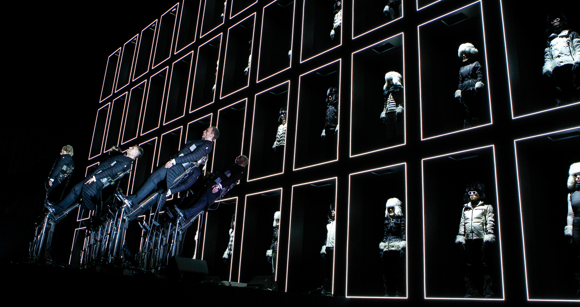 Your winter symphony soundtrack awaits…Moncler Grenoble, the collection designed to offer the utmost performance for use both in the high mountains and day-to-day city life, transforms the stage of New York’s Hammerstein Ballroom into a unique audio-visual experience. Sixty choristers, dressed entirely in black and white, lined up in a structure on several levels and the Pendulum Choir, dressed in down-filled morning suits, placed on hydraulic platforms produce a thoroughly contemporary experience; an identical approach adopted by Moncler.