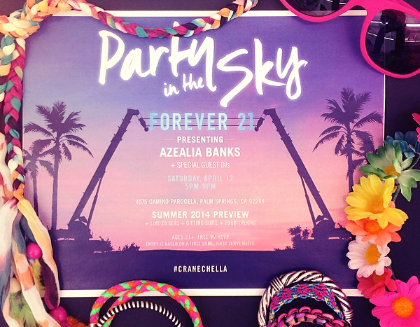 Perhaps competing with Superdry’s ‘Popchella,’ Forever 21 renamed the festival ‘cranechella.’ This concept saw a ‘party in the sky’ where a shipping container was lifted by a crane. It was here that Azealia Banks performed to huge crowds which proved to be one of the most interesting stages on site.