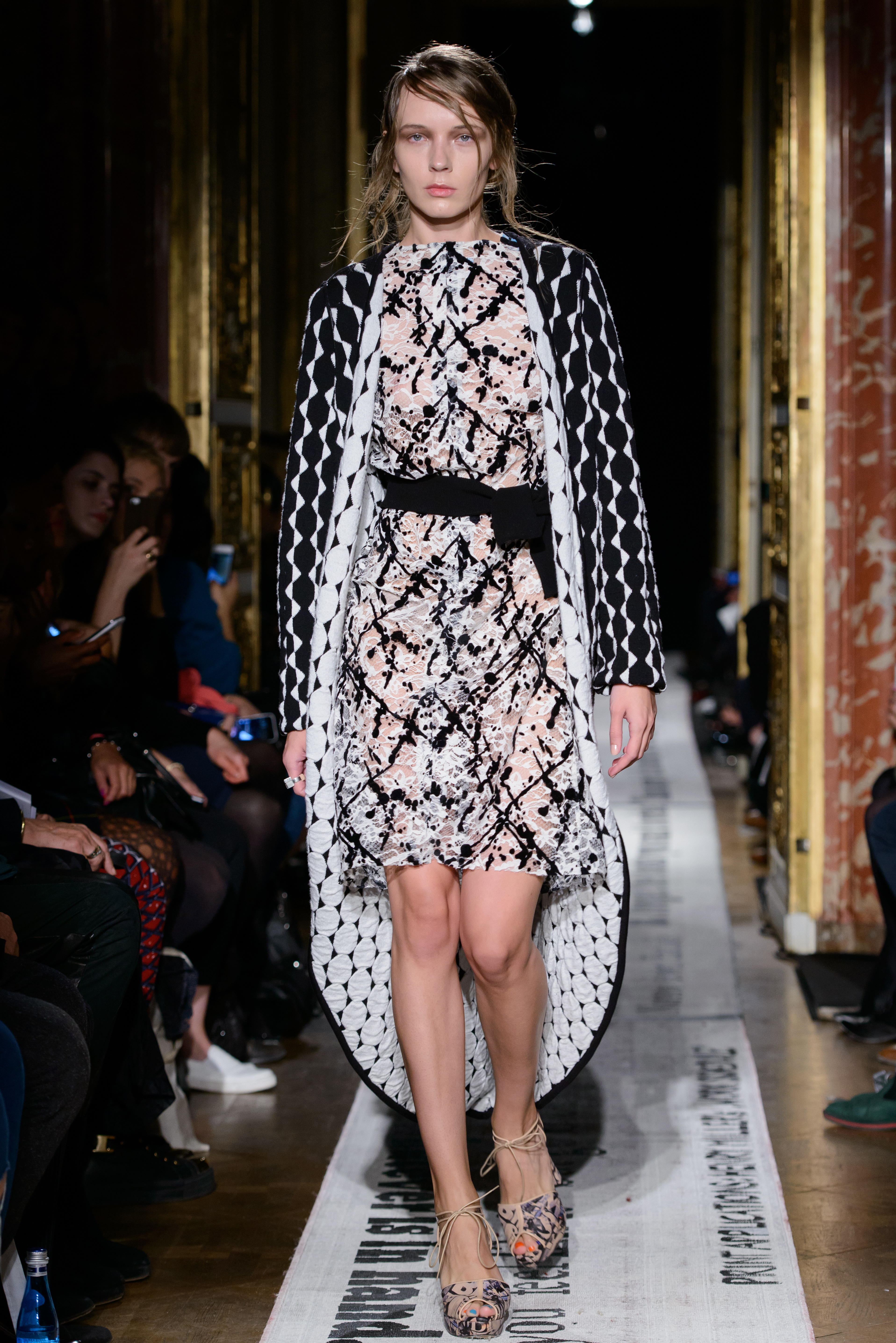 The decadently detailed collection, which features structured lace pieces and contemporary reworkings of 1920s-influenced silk designs, is mainly composed of a limited but striking pallet of black, muted pink, white and gold. Every detail, from the resplendent deep red and gold setting to the almost exclusively blonde, lightly waved hair of the Polish models, seemed expressly selected to compliment and accentuate the exquisite collection.