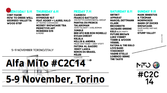 After its London event at Village Underground, in partnership with Field Day and its Italian previews (in Milan and Siena, in collaboration with MiTo and Siena 2019), Alfa MiTo Club To Club returns to Torino, Italy from 5th to 9th November 2014, showcasing the very best in contemporary electronic music, arts and culture. One of the premier European festivals dedicated to electronic music (with over 35,000 people attending the previous edition), Alfa MiTo Club To Club’s 14th edition, #C2C14, coincides with the week in which Torino plays host to the high profile Torino Piemonte Contemporary Arts Week. For the sixth consecutive year, Alfa MiTo Club To Club has been chosen as the best international festival of the season by Resident Advisor, the leading online magazine for electronic music: Club To Club was the best event in its November/December Top 10, which includes renowned festivals in Australia, USA, Iceland, Argentina, Belgium and the Netherlands, “For one week of the year, Torino becomes Europe’s most thriving hub for forward-thinking electronic sounds. This is thanks, of course, to Club To Club.”