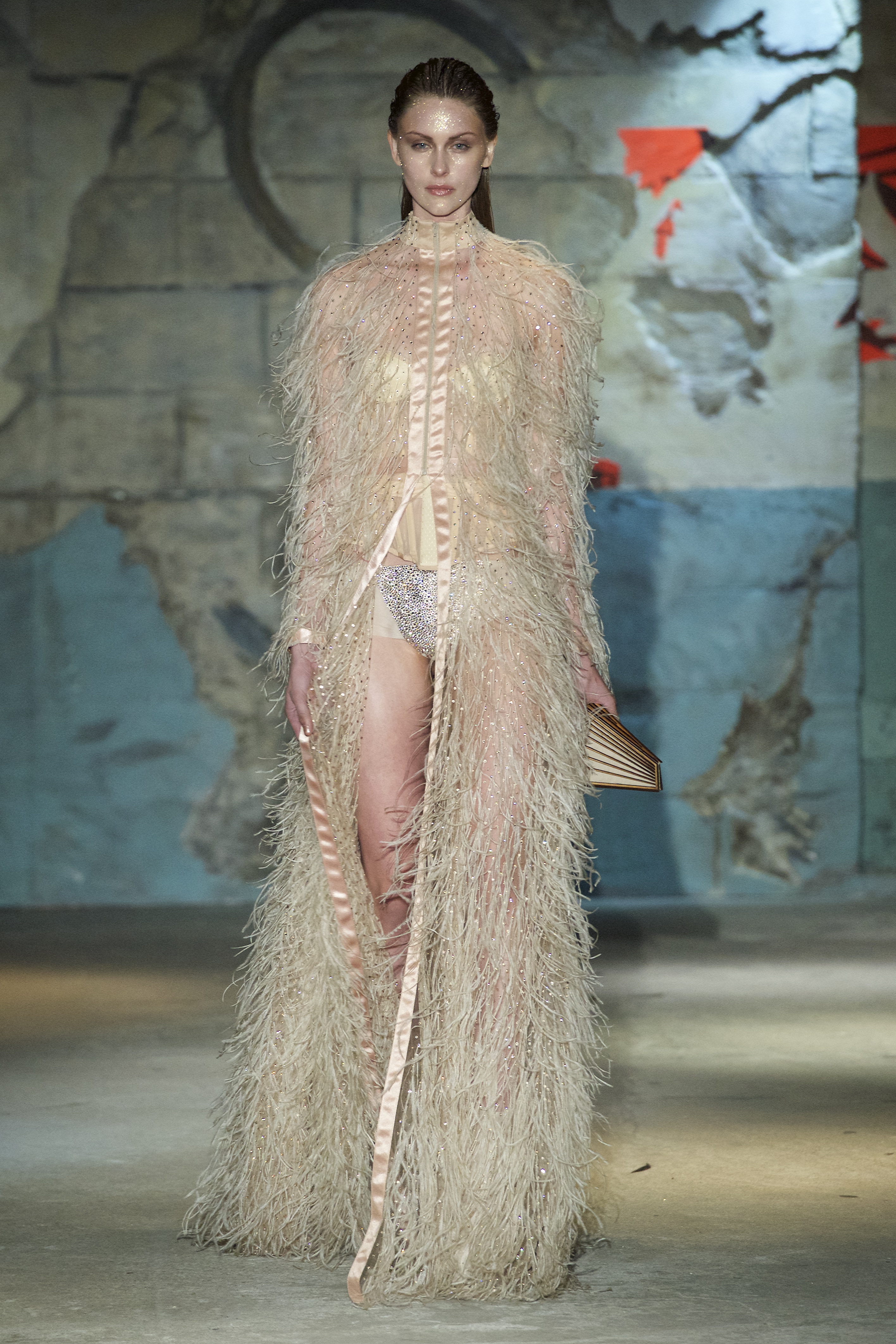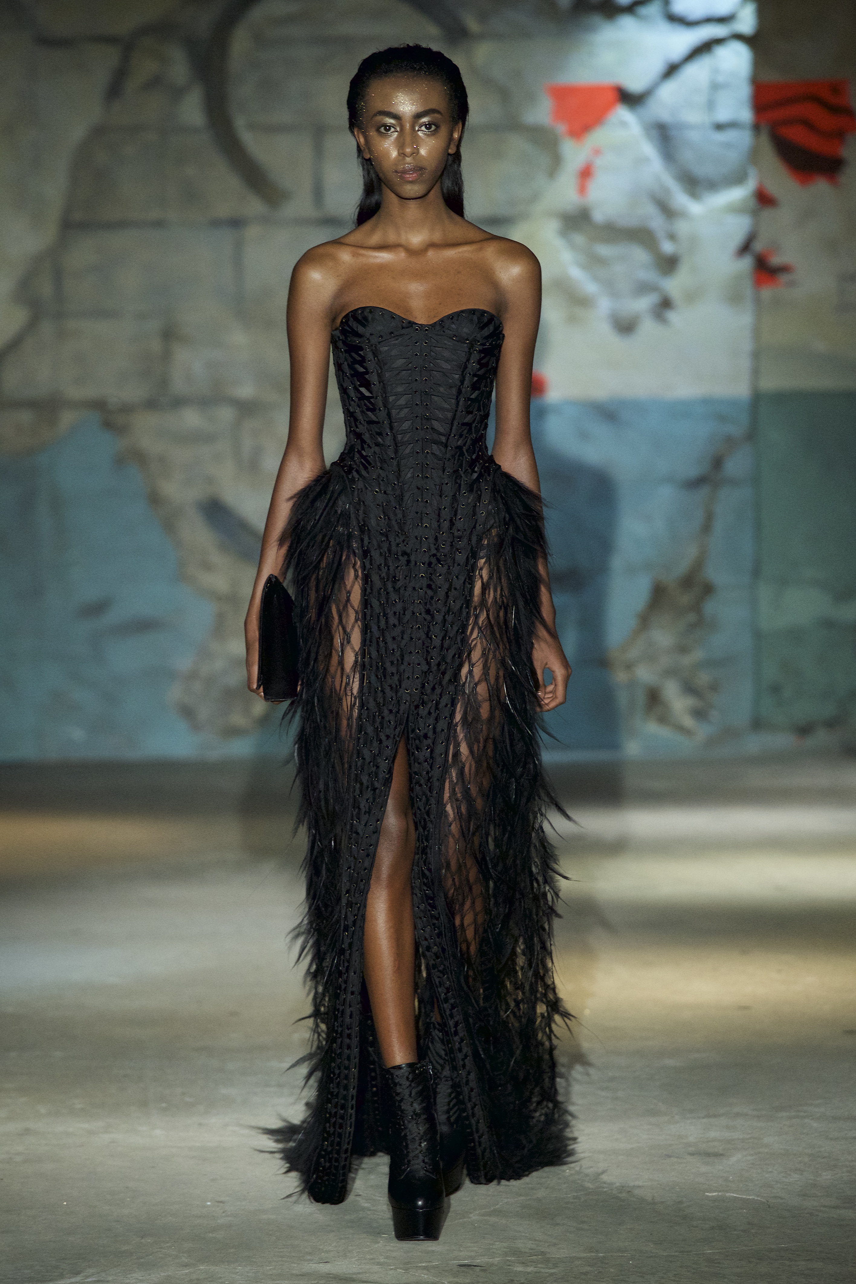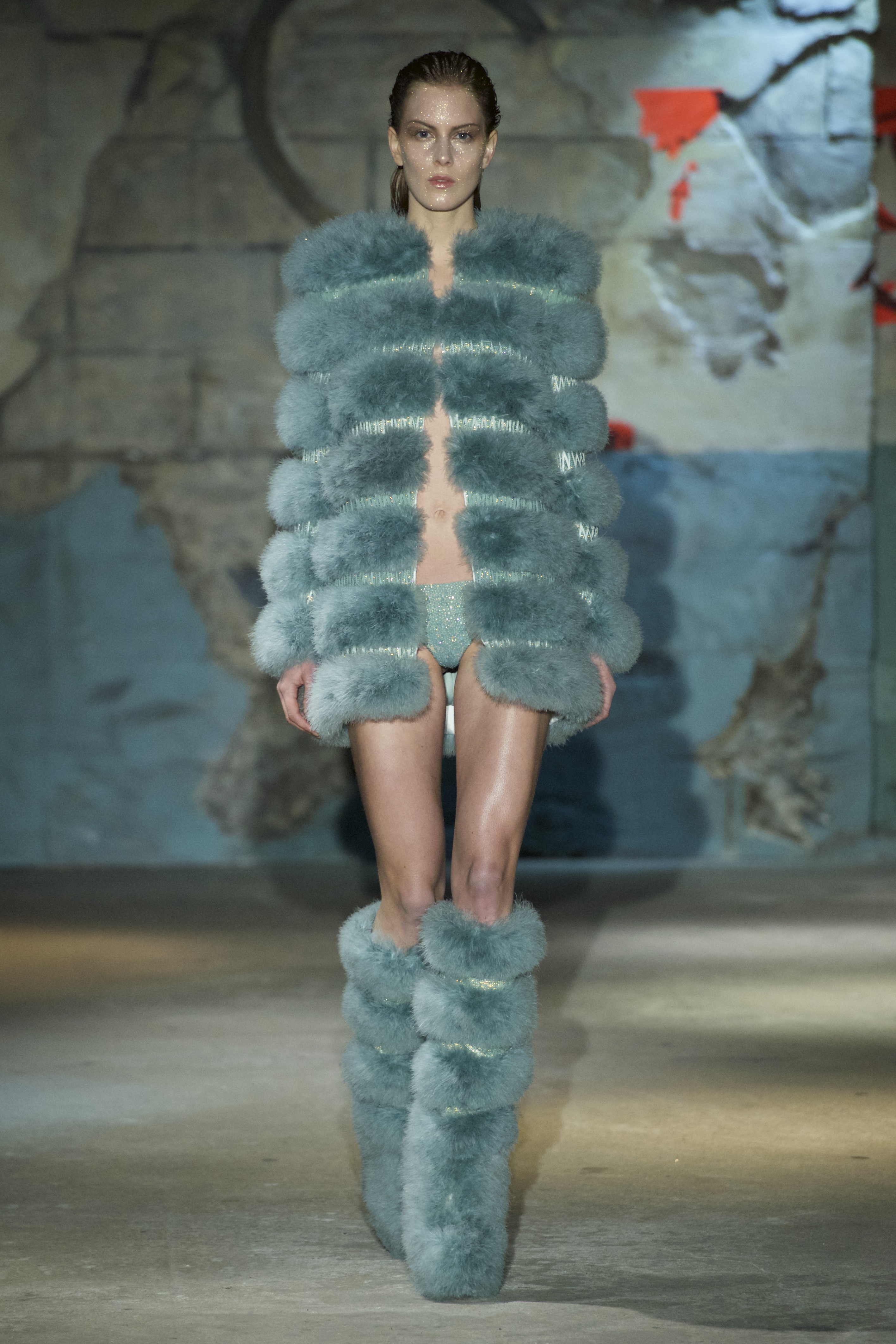 Aside from the fur shrugs and bombers, there was corseted gowns and ostrich feathers.