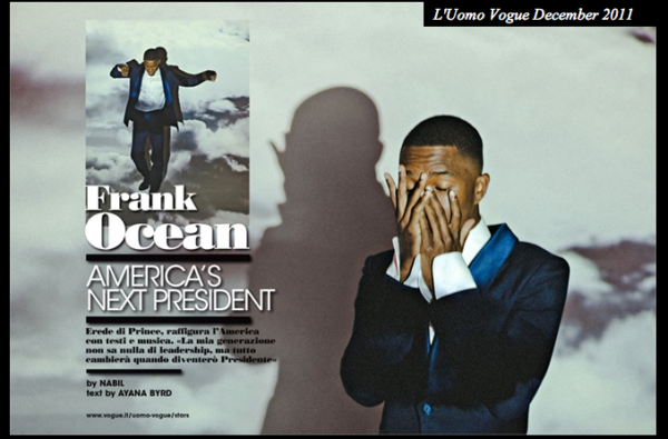 My favourite artist of spring 2011. Now vogue are catching on. Check out his mixtape and channel on Vevo http://www.youtube.com/user/FrankOceanVEVO